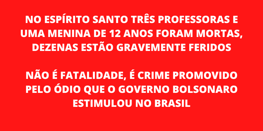 NO ESPÍRITO SANTO TRÊS PROFESSORAS E UMA MENINA DE 12 ANOS FORAM MORTAS, DEZENAS ESTÃO GRAVEMENTE FERIDOS – NÃO É FATALIDADE, É CRIME PROMOVIDO PELO ÓDIO QUE O GOVERNO BOLSONARO ESTIMULOU NO BRASIL
